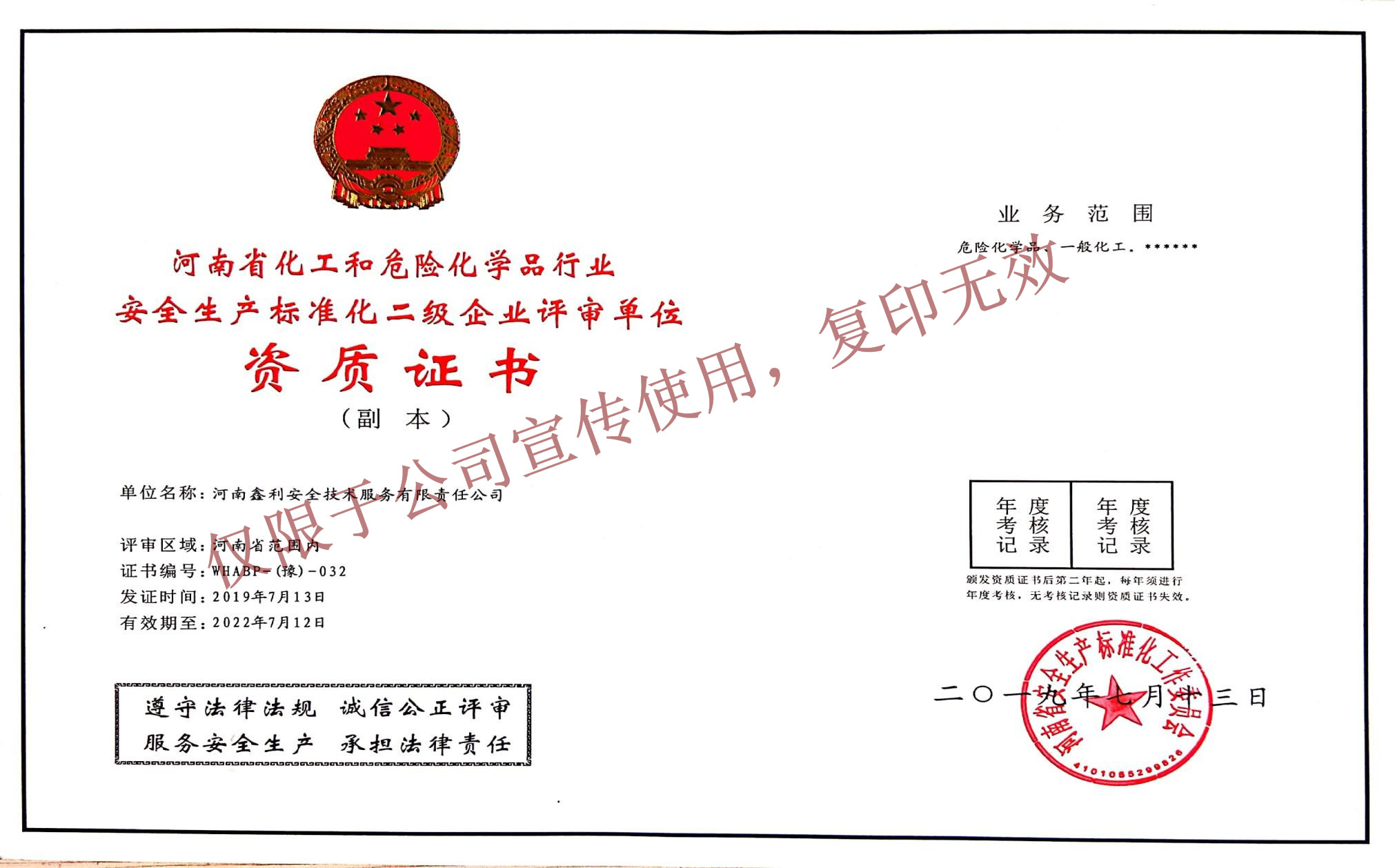 河南省化工和危險(xiǎn)化學(xué)品行業(yè)安全生產(chǎn)標(biāo)準(zhǔn)化二級(jí)企業(yè)評(píng)審單位