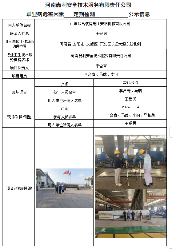 中國(guó)聯(lián)合裝備集團(tuán)安陽(yáng)機(jī)械有限公司職業(yè)病危害定期檢測(cè)