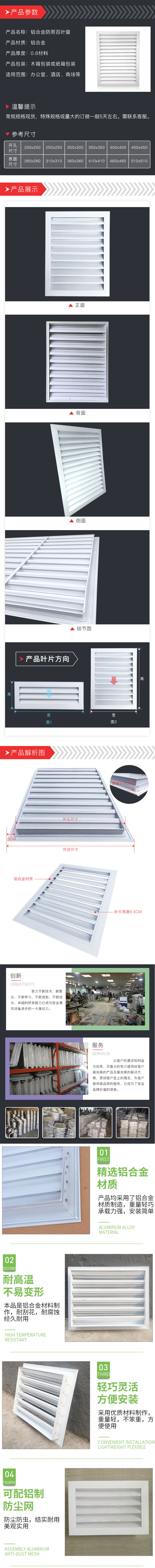 防雨百葉風(fēng)口可用做回風(fēng)口和新風(fēng)口風(fēng)口后面可加鋁板網(wǎng),尺寸可由用戶選定。防雨百葉風(fēng)口是外墻吸、排風(fēng)口的裝飾面,其結(jié)構(gòu)有阻擋雨水濺入內(nèi)部的功能;
