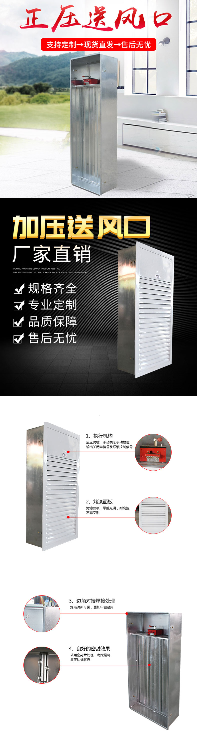 作用:當發生火災時,其內部的電動執 行器會打開風口,溫感煙感或者是手動火災報警會開啟,塔樓頂正壓風機自動打開,對送風豎井進行加壓送風,樓梯的前室通過正壓送風口會源源不斷的對前室進行 送風,使前室維持正壓,保證煙氣不會在這個區域蔓延,而給人逃生的空間。當溫度高于280°C時人已無逃生可能性,其內部熔斷器會熔斷,風口自動關閉,防 止火勢蔓延。